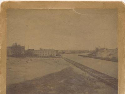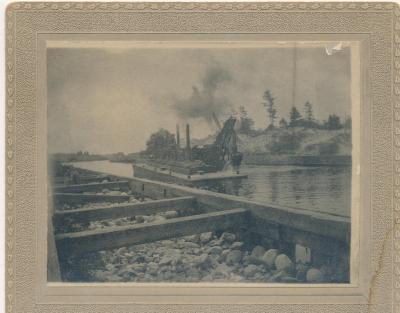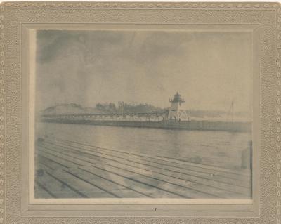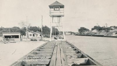 Labeled The wood piers, stones in the cribs. Narrow board walk. |